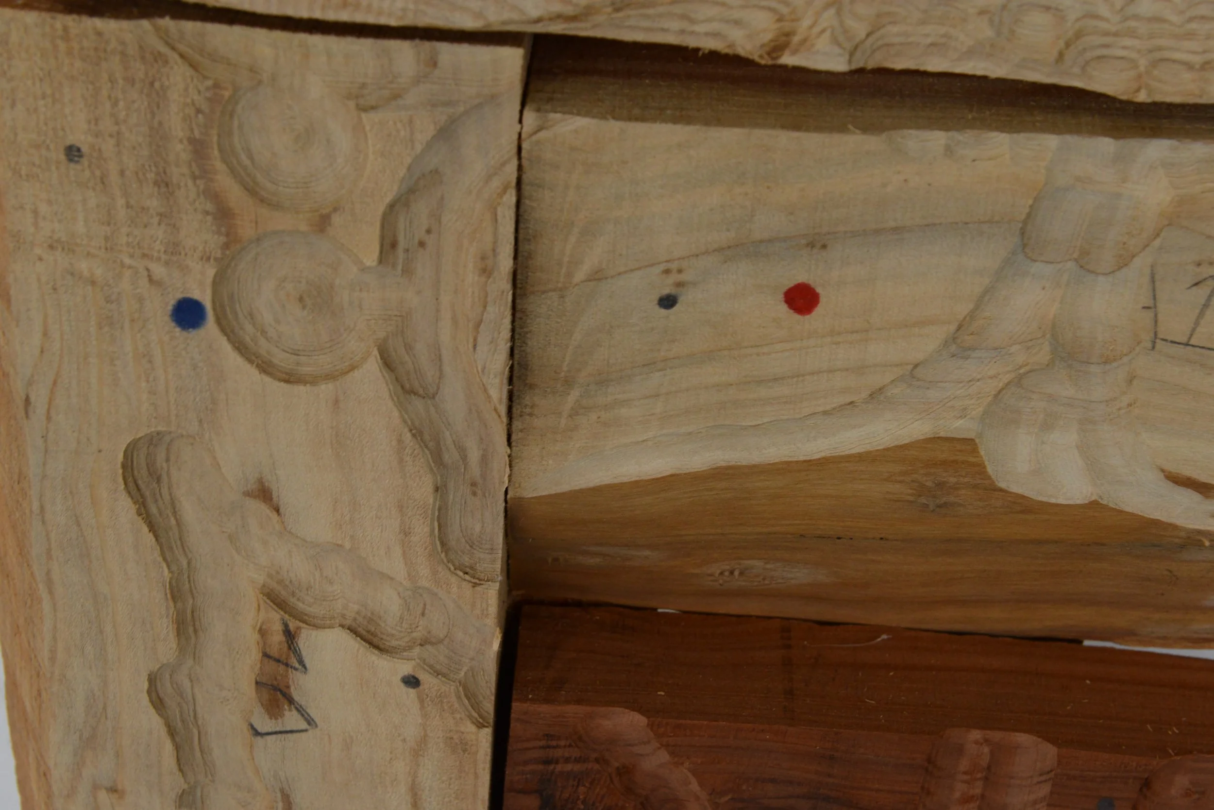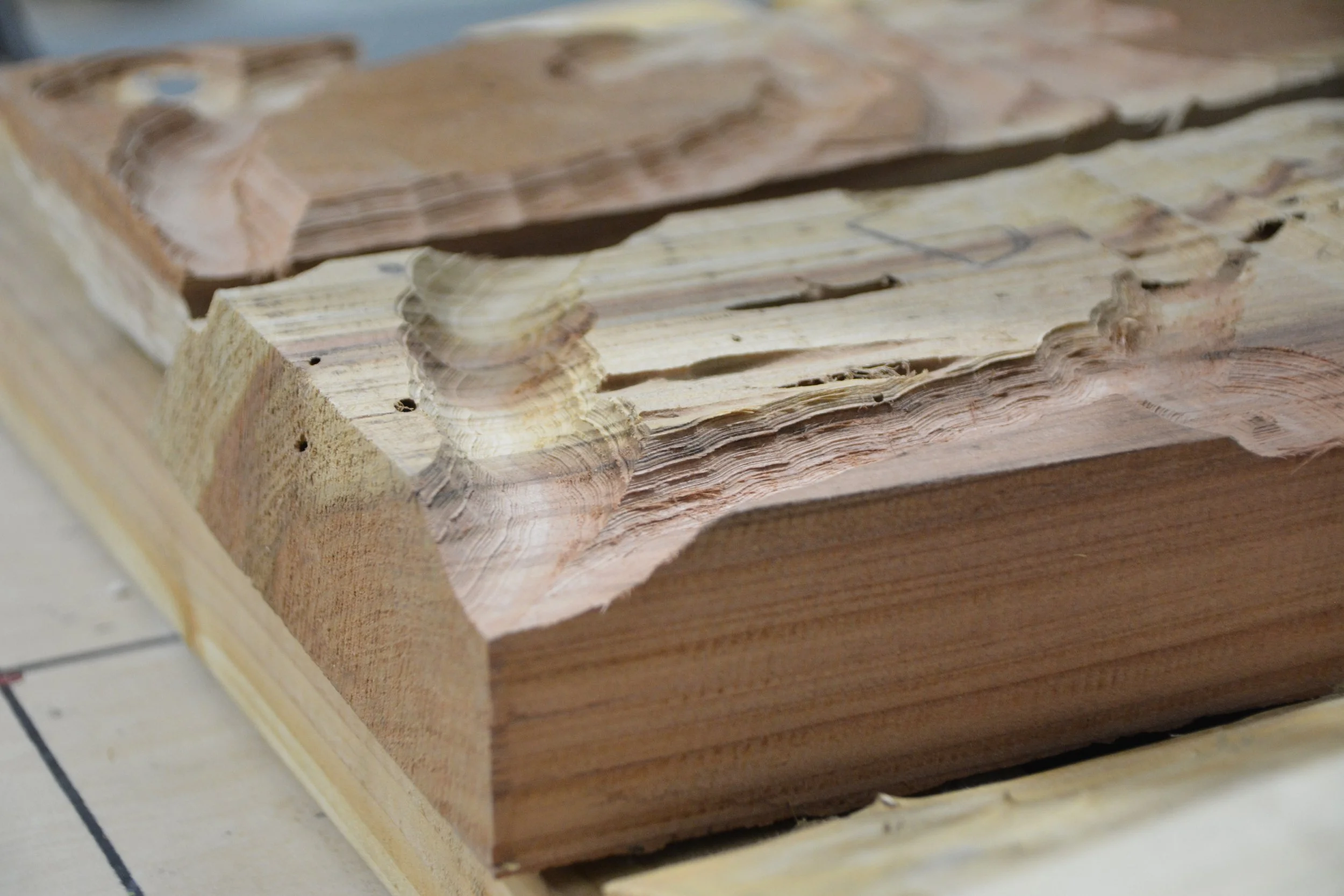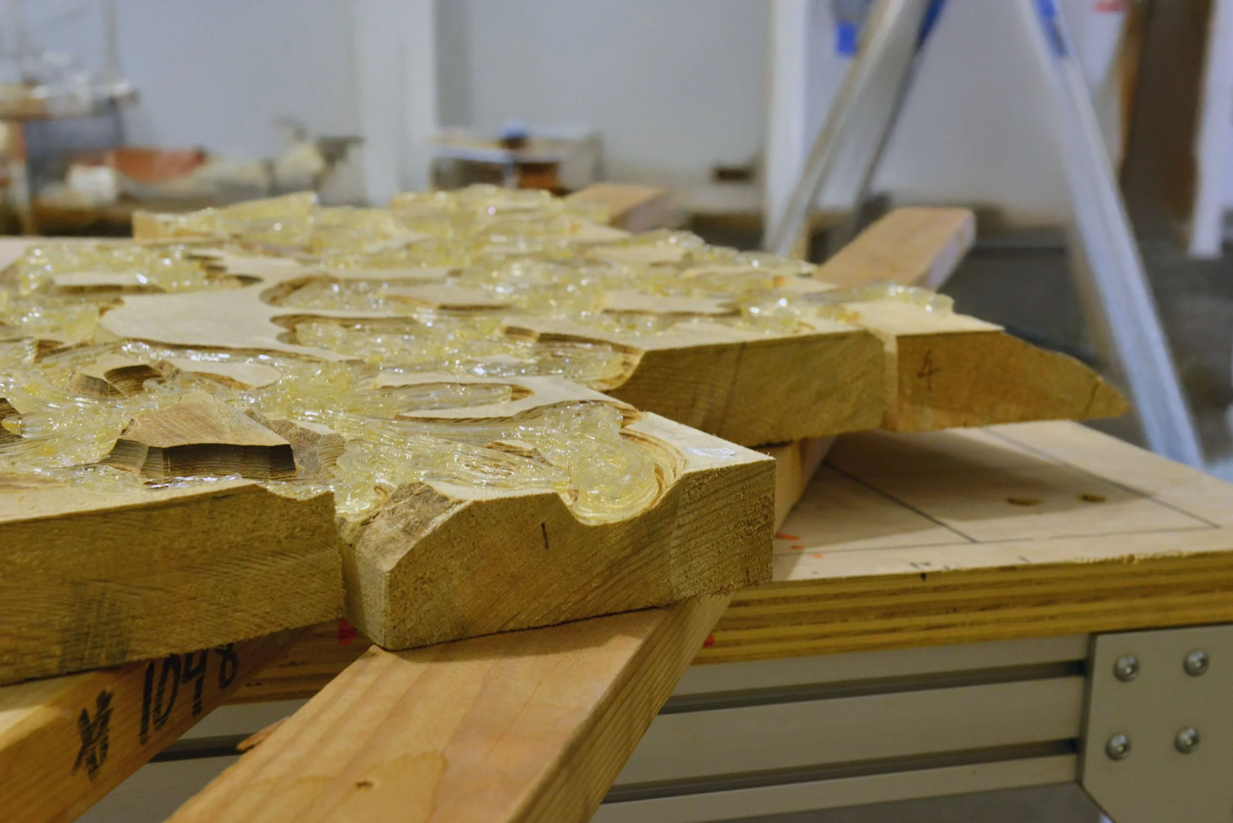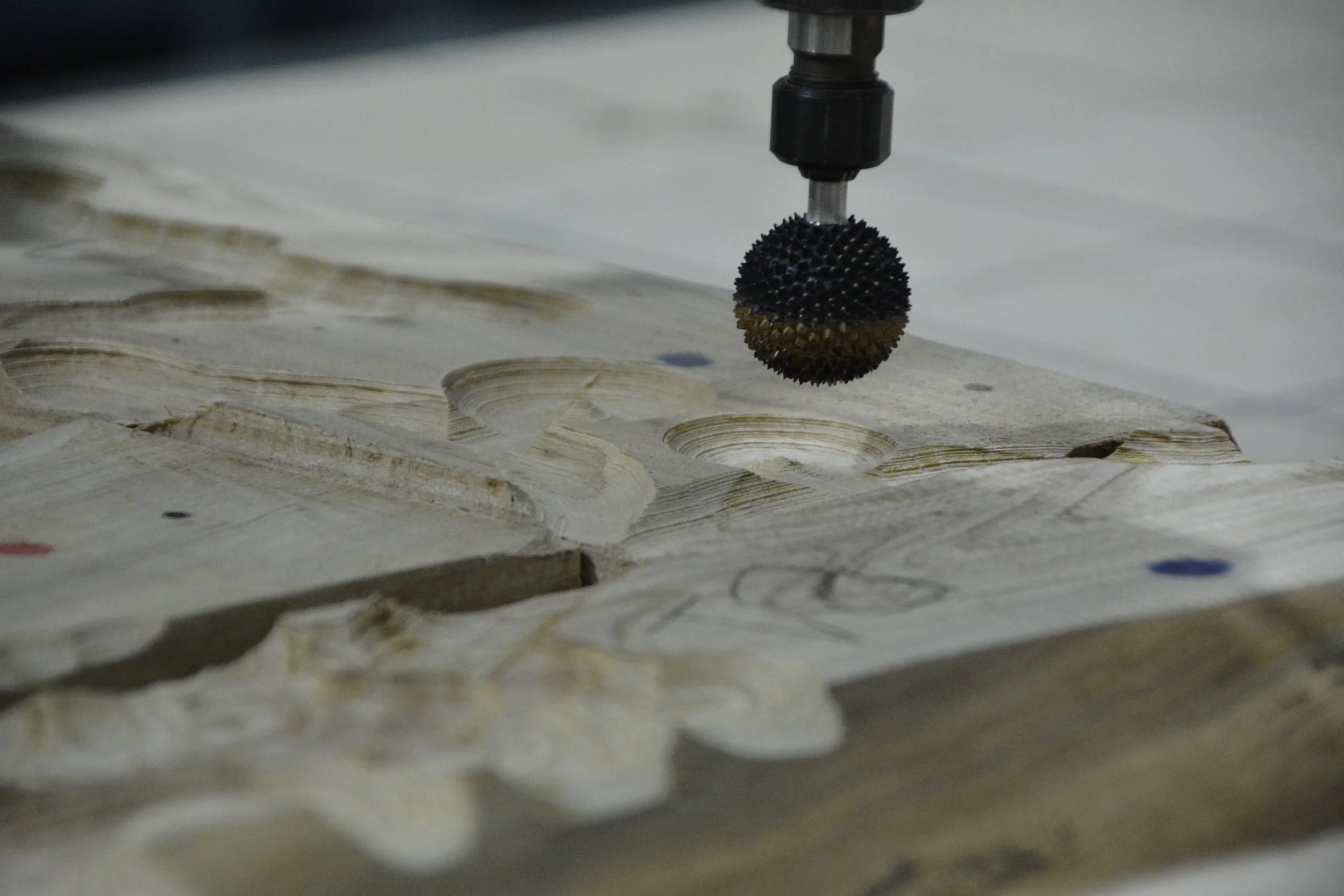 The tabletop is milled by a robotic arm from solid wood; the table supports are printed directly in filament.